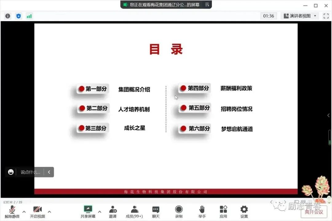 为深入学习贯彻党的二十大精神,落实党中央、国务院“稳就业”“保就业”决策部署,进一步做好公司2023届毕业生就业创业工作,解决员工就业问题,根据《bw必威西汉姆联官网2023届毕业生校园招聘月系列活动方案》要求,2022年11月23日晚,公司联合通辽梅花生物科技有限公司于腾讯会议召开2023届毕业生线上宣讲会。会议由通辽梅花生物科技有限公司校招负责人李贺新主持,化学化工公司党总支副书记刘朋、团学办公室主任张一帆、2023届毕业生辅导员孟庆永及毕业生参加了会议。