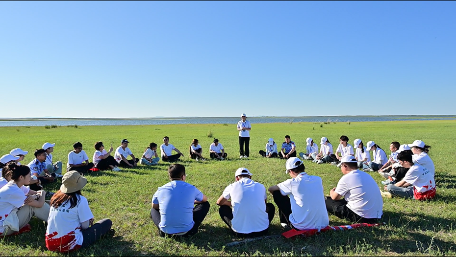 6日,实践团来到新巴尔虎左旗第一边境管理大队,与马背巡防队队员们共同开展巡边活动。这支队伍的组成多元而专业——既有边境派出所的民警,也有来自各嘎查的基层干部和牧民群众,无论是酷暑还是严寒,他们始终坚守在边境一线,用责任守护着祖国边境的安全稳定。来到第二站吉布胡郎图边境派出所,实践团成员与民警一起沿湖巡查,捡拾垃圾,用实际行动守护这片“草原明珠”。巡湖结束后,实践团在草原上围坐成圈,开展了一堂特殊的思政课。没有黑板和教室,天地就是最好的课堂。成员们相互交流对生态环境建设的认识,分享参与环保行动的感受,深刻领悟到保护生态环境就是保护我们的美丽家园。