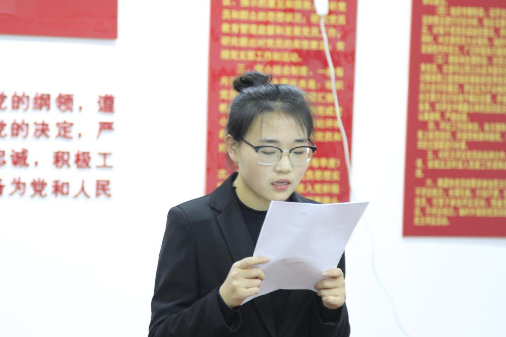党支部副书记王慧代表老党员发言,她表示2020年是极为不平凡的一年,这一年,我们经历了新冠肺炎疫情,面对这场突如其来的疫情,中国共产党带领全国各族人民,尽全国之力抗击疫情,在疫情期间,涌现出了无数令人感动的故事,同时也展现出了共产党人的不畏艰险、舍己为人的精神。希望所有党员同志做到以下几点,一是要不断加强自我学习,积极锤炼本领,坚持引领正确的政治方向,凝聚广老员工的青春力量;二是做听党话跟党走的“95后”“00后”党员,争做学习标兵,积极学好专业知识,掌握专业技能,才能为祖国人民多做贡献,充分实现自己的人生价值;三是做为员工党员,深入基层,多听多看,多关心帮助同学,想他们之所想,急他们之所及。四是心怀感恩,学会感恩,感恩不仅仅要懂得感恩父母、感恩老师,更要懂得感恩党和国家。正值青春的我们,要继续保持昂扬向上的精神状态,努力拼搏学习,将知识应用到为人民服务当中去,勇挑中华民族伟大复兴的重担!