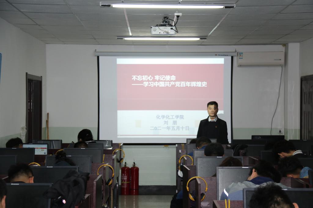 为了落实《关于深入推进2021年全区公司共青团“驻校蹲班”工作的通知》、《bw必威西汉姆联官网共青团“驻校蹲班”工作实施方案》相关文件精神,进一步落实党史学习教育,加强党员领导干部与员工的联系,化学化工公司于5月10日在科技楼446教室开展题为“不忘初心、牢记使命——学习中国共产党百年辉煌史”党课,由化学化工公司党总支副书记刘朋主讲,2018级化学工程与工艺班全体同学参加此次活动。