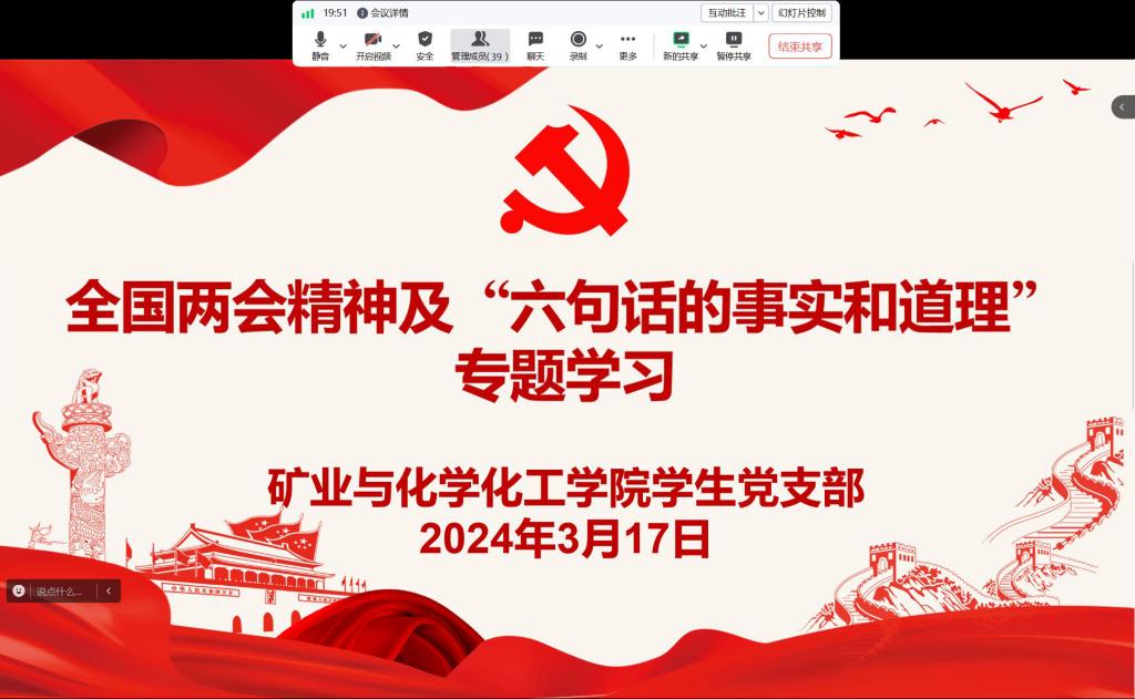 十四届全国人大二次会议和全国政协十四届二次会议分别于3月5日、3月4日在北京召开,为学习贯彻全国两会精神,引导员工党员学时事、观大势,3月17日下午,bw必威西汉姆联官网员工党支部开展全国两会精神及“六句话的事实和道理”专题学习。会议由员工党支部书记孟庆永主持,支部全体党员参加。