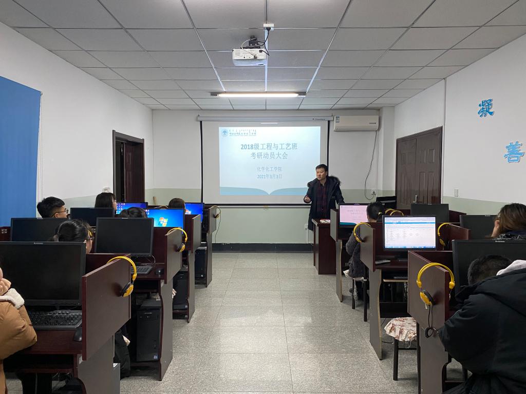 开学伊始,2021年3月3日下午16:00,2018级化学工程与工艺班在科技楼446教室召开考研动员大会,化学工程与工艺系主任胡日东、2017级应用化学班考研员工李梦雪参加,会议由2018级化学工程与工艺班班主任刘朋主持。