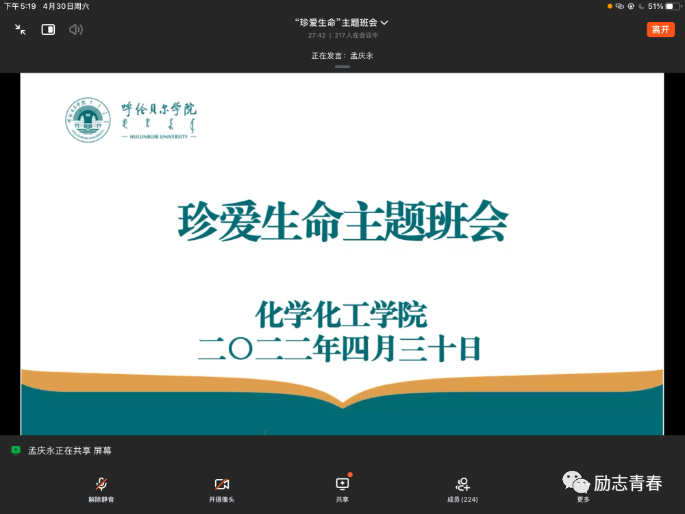 为了进一步对广老员工进行珍惜生命的教育,引导员工正确认识人的生命,培养员工珍惜、尊重、热爱生命的态度,增强对生活的信心和社会责任感,树立正确的生命观,使员工善待生命、完善人格、健康成长,化学化工公司2018级、2019级员工于2022年4月30日召开“珍爱生命”主题班会,此次班会由辅导员孟庆永老师主持,2018级、2019级共230余名员工参会。