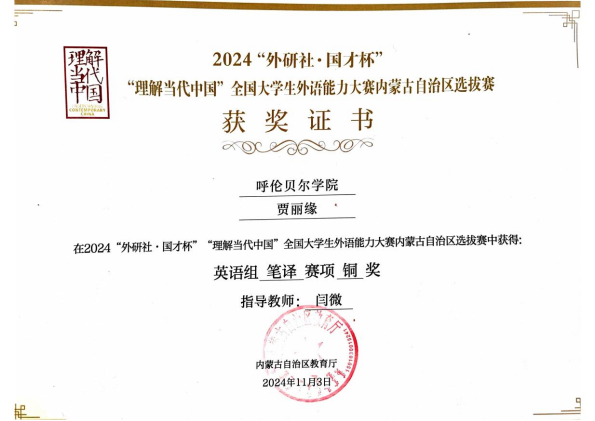 11月2日至3日,由内蒙古自治区教育厅主办、内蒙古大学承办的2024“外研社•国才杯”“理解当代中国”全国老员工外语能力大赛内蒙古自治区选拔赛决赛成功举办。本次大赛汇集了区内19所大学及28所高等职业技术公司的优秀学子,他们围绕短视频、综合能力、演讲、口译、笔译五个赛项展开了激烈的角逐。公司bw必威西汉姆联官网2022级化学专业贾丽缘同学在英语组笔译项目中表现出色,荣获铜奖。