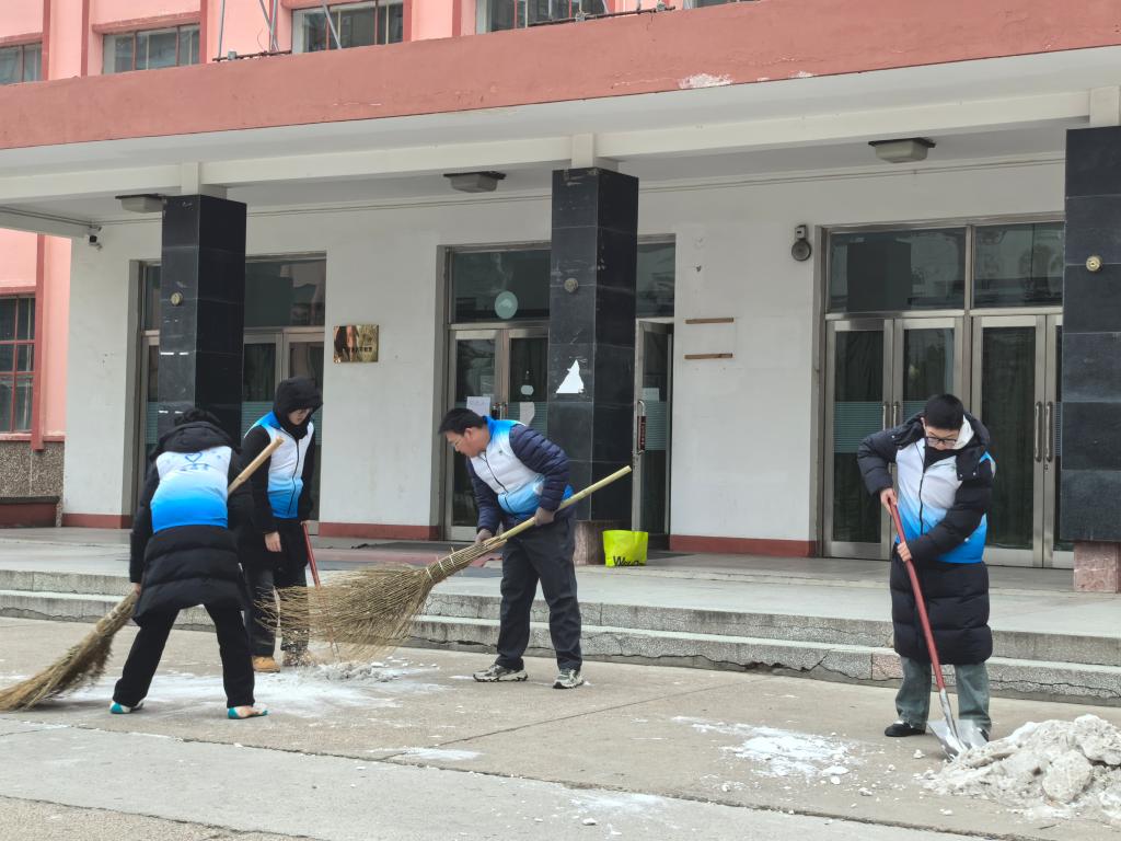 活动当日,志愿者们早早集结,身着统一的蓝白渐变志愿马甲,携带扫帚、铁锹等工具赶赴现场。尽管气温骤降,但大家的服务热情丝毫未减。现场分工明确、干劲十足:有的挥锹破除雪堆,有的持扫帚清扫散落积雪,还有的俯身清理角落垃圾。扫帚与地面的摩擦声、铁锹铲雪的碰撞声交织回荡,奏响了冬日里动人的“奉献乐章”。
