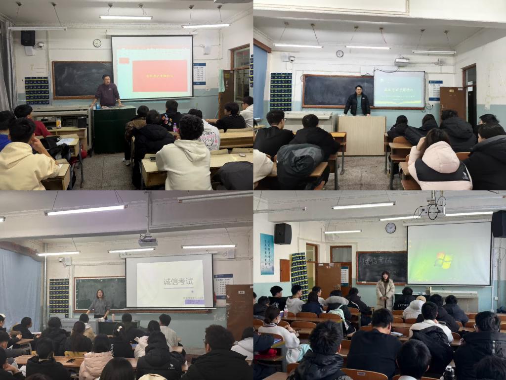 班会中辅导员向全体同学提出明确要求一是端正学习态度扎实复习以真实水平迎接考试;二是严守考场纪律杜绝侥幸心理维护考试的公平公正;三是同学间相互督促共同营造诚实守信积极向上的考试氛围。